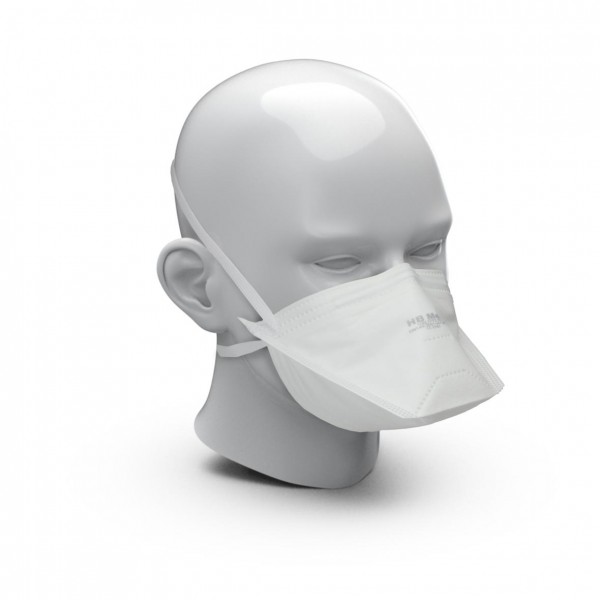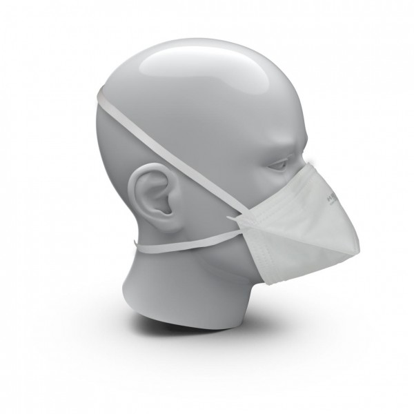 FFP2 partikelfiltrierende Halbmaske ohne Ausatmungsventil mit zwei stabilen, dehnbaren Gummibändern zur Befestigung der Maske am Hinterkopf.