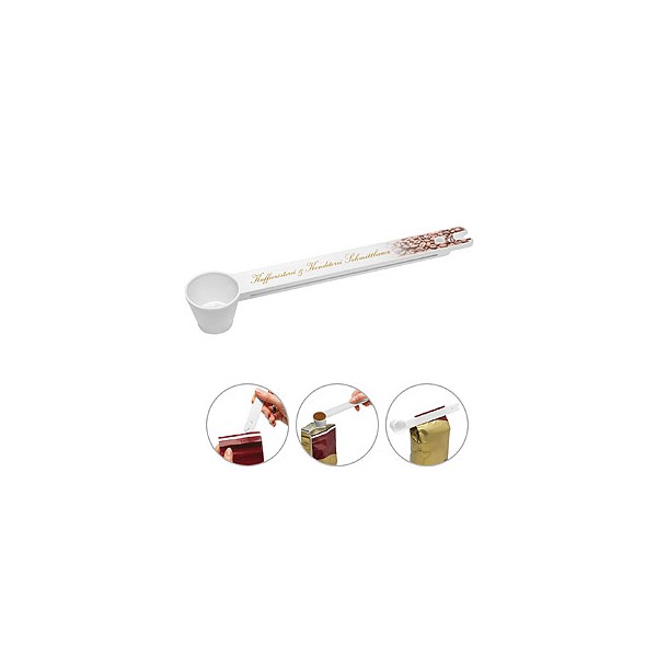 mit Schneide zum Öffnen von Kaffee-/Teeverpackungen und Verschluss für geöffnete Kaffee-/Teeverpackungen Maße: ca. 188 x 35 mm Druckart: T (Tampondruck) Druckgruppe: A Druckfläche: 120 x 18 mm (max. 2c) Gewicht: 19g Material: PS Farben: Grundfarbe:weiß, rot, blau, schwarz