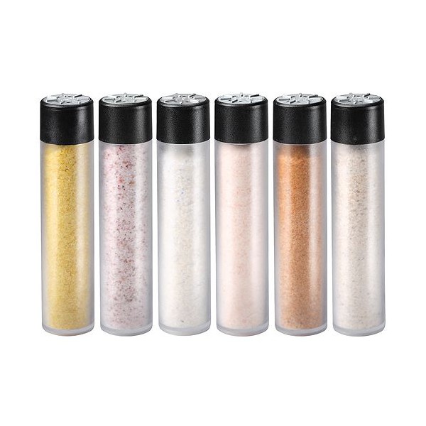 Set bestehend aus 6 Stück Kunststoffstreuern. Befüllt mit 6 verschiedenen Salzen: - Cocos Curry - Rosen - Feuer - Himalaya - Alpen und - Persien Salz, Set verpackt in Kartonbox. Die Werbeanbringung erfolgt im Tampon-Druck.