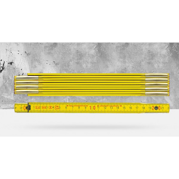 Holzgliedermaßstab* aus Buchenholz, Gliederstärke 3,0 mm, Gliederhöhe 16 mm, Gliederzahl 10, durchgenietete Gelenke und vermessingte Stahlfedern sorgen für dauerhafte Maßhaltigkeit. 2 m Länge mit Duplex-Teilung. Auch in 1 m Länge mit 6 Gliedern lieferbar.