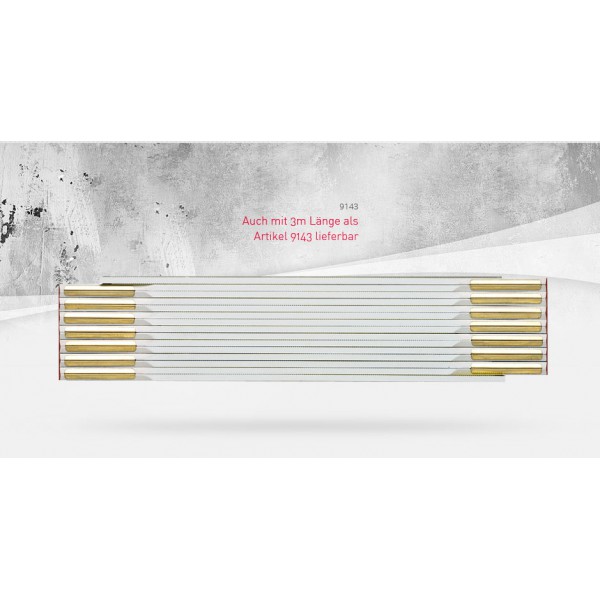Winkeleinteilung in der Gelenkverbindungdes ersten Maßstabgliedes. Weiße Lackierung, 2 m Länge mit Duplex-Teilung. 50 Stück VE. * Alle Holzgliedermaßstäbe in Genauigkeitsklasse EG III.