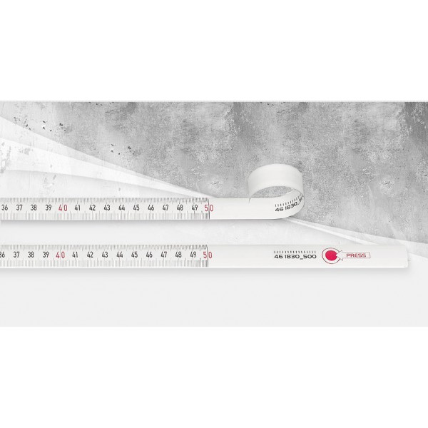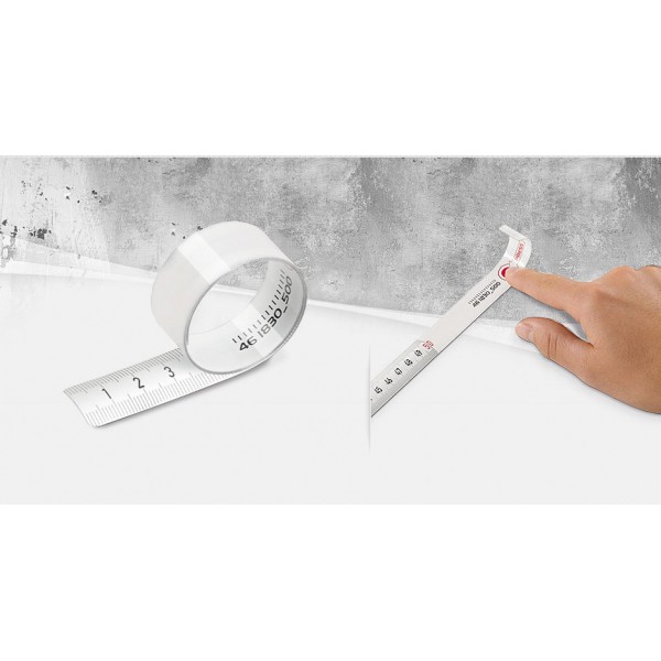 Rostfreies Edelstahlband, weißlackiert, unzerbrechlich; langlebig; Band rollt selbstständig aus; im ausgerollten Zustand sehr biegesteif. Formstabil im aufgerollten Zustand