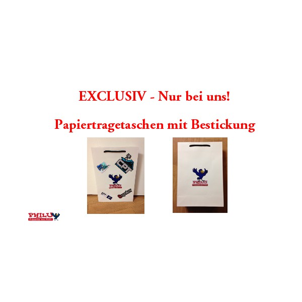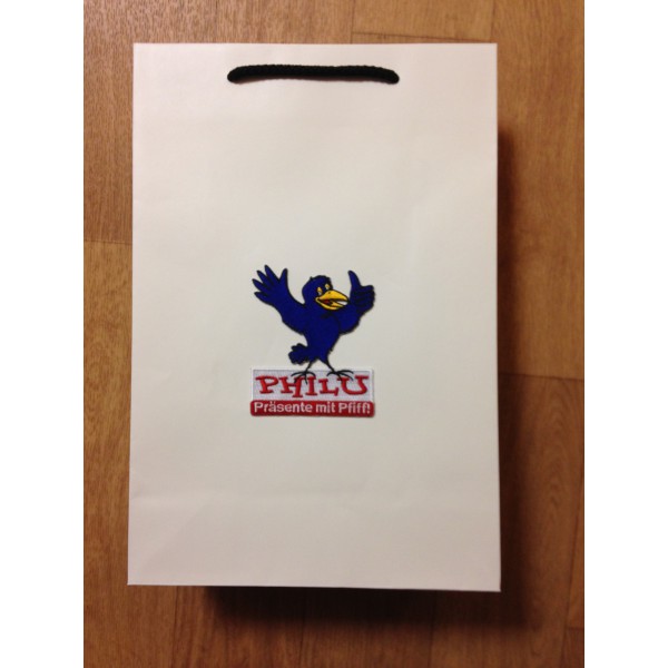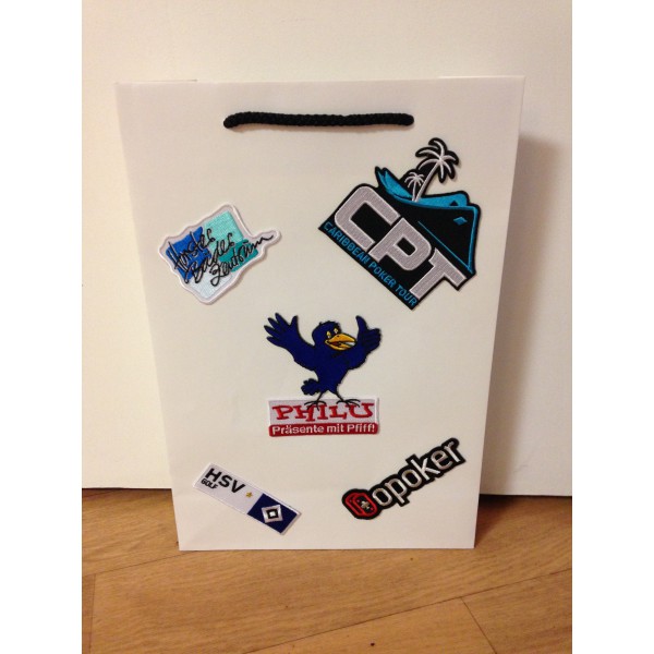 Versehen mit unseren hochwertigen Stickaufklebern werden diese Papiertragetascen aus Kunstdruckpapier mattplastifiziert zu etwas Besonderem und Außergewöhnlichem. Und das mit Doppelnutzen, denn die Stickaufkleber können abgezogen und auf Textilien weiterverwendet werden.